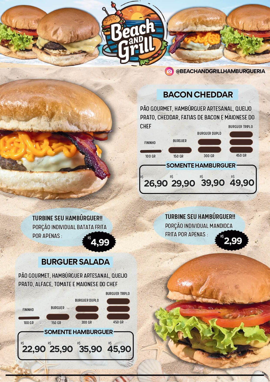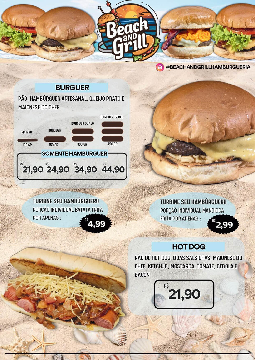 Somos apaixonados por sabor! Na Beach and Grill, servimos hambúrgueres artesanais, espetinhos suculentos e porções deliciosas, tudo preparado com ingredientes frescos e cuidado especial.